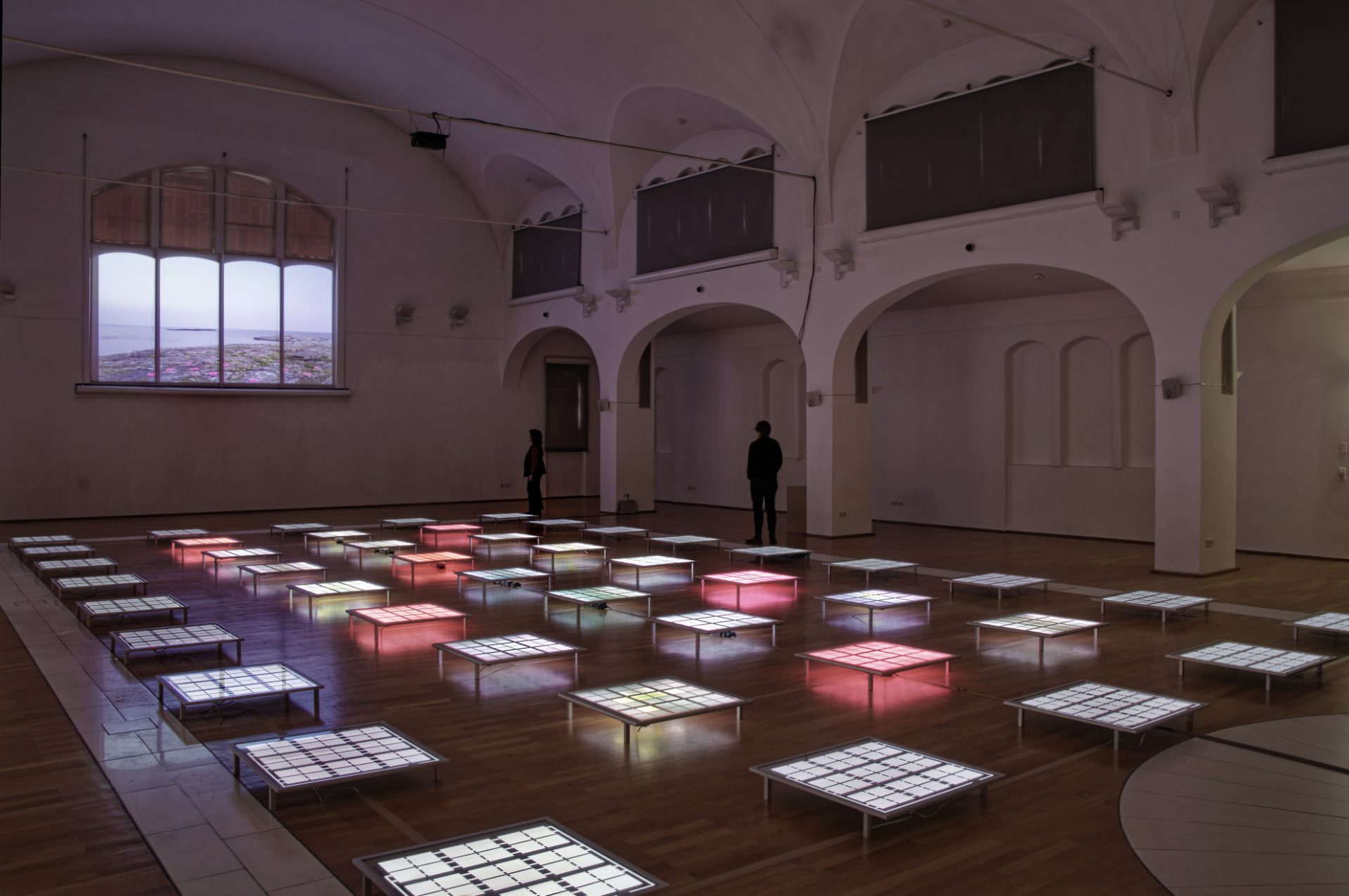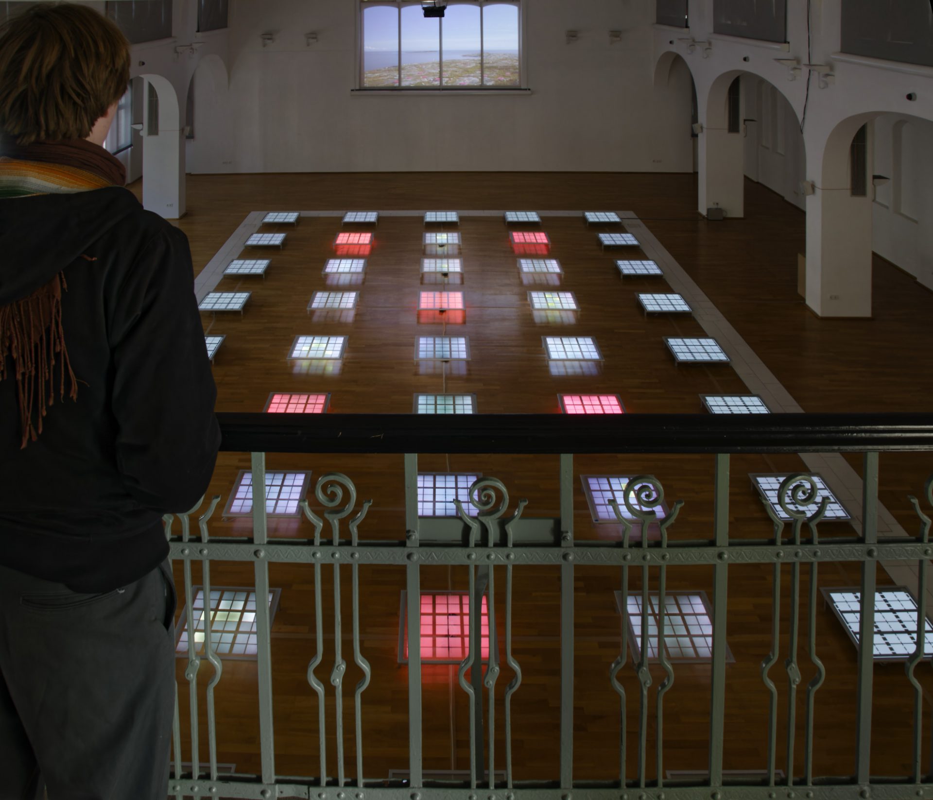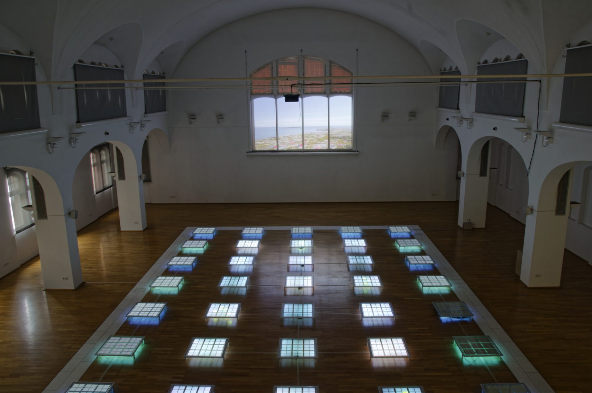 Die Arbeit erzeugt ein Wahrnehmungsfeld, in dem akustische Impulse Lichtbewegungen aktivieren. Das Leuchten der Glasflächen, die Verzögerungen zwischen Klangereignis und Lichtereignis sowie die räumliche Verteilung der Module lassen ein Bild entstehen, das sich im Gehen und Hören fortlaufend verändert. Der Raum wird rhythmisch gegliedert und als eigenes Medium erfahrbar, in dem sich die Erinnerung an die Wasseroberfläche des ehemaligen Bades