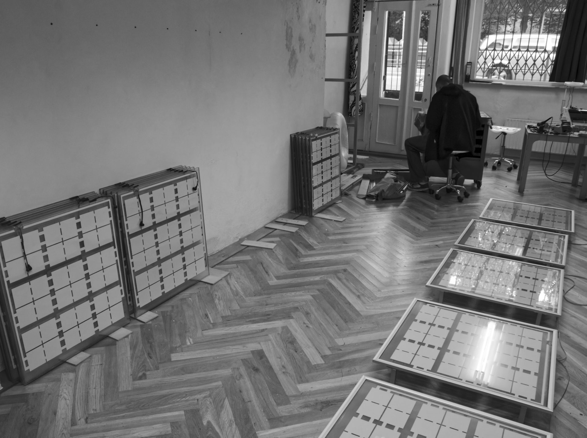 Lichtinstallation; mit EL- und LED-Glasmodulen, Mehrkanal-Ton- und Lichtsystem, MIDI-/DMX-Steuerung, Rechner